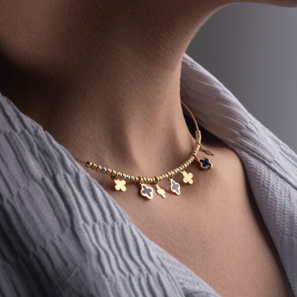 این گردنبند منحصربهفرد با ترکیب طلای گرم و نقرهی درخشان، جلوهای از تضاد هماهنگ را به نمایش میگذارد. اتصال دو نیمه با ردیفی از نگینهای ظریف، ظرافت و شکوه را به طراحی آن اضافه کرده است. انتخابی فوقالعاده برای کسانی که به ترکیب استایلهای کلاسیک و مدرن علاقهمند هستند.